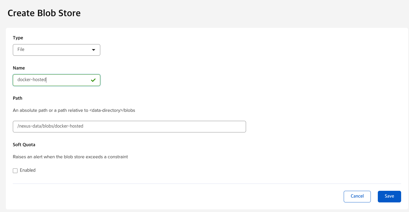 Create Blob Store 버튼을 누르고 File type으로 docker-hosted 이름 입력후 Save 한다.