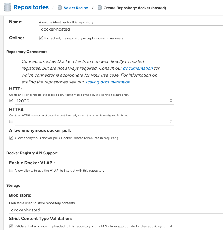 Repositories 메뉴로 이동하여 Create repository를 클릭하고 docker(hosted)를 클릭해준다. 상세 정보 입력을 하는데 Name, HTTP, Blob store 와 같은 정보를 다음과 같이 입력해주고 Create repository 버튼을 눌러 생성해준다.
