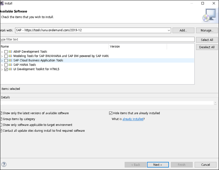 Eclipse 실행 > Help >> Install New Software > Add > Name: SAP, Location: https://tools.hana.ondemand.com/2019-12 입력 > Add 버튼 클릭 > UI Development ToolKit for HTML5 체크 후 Next ... > Eclipse 재시작 하여 설치 완료