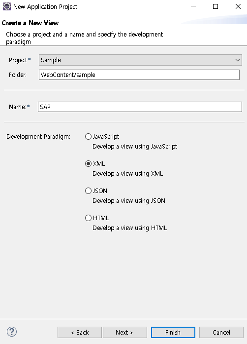 File > New > Project > SAPUI5 Application Development - application Project > Next > Project name: Sample > Next > Name: SAP , Development Paradigm - XML > Finish