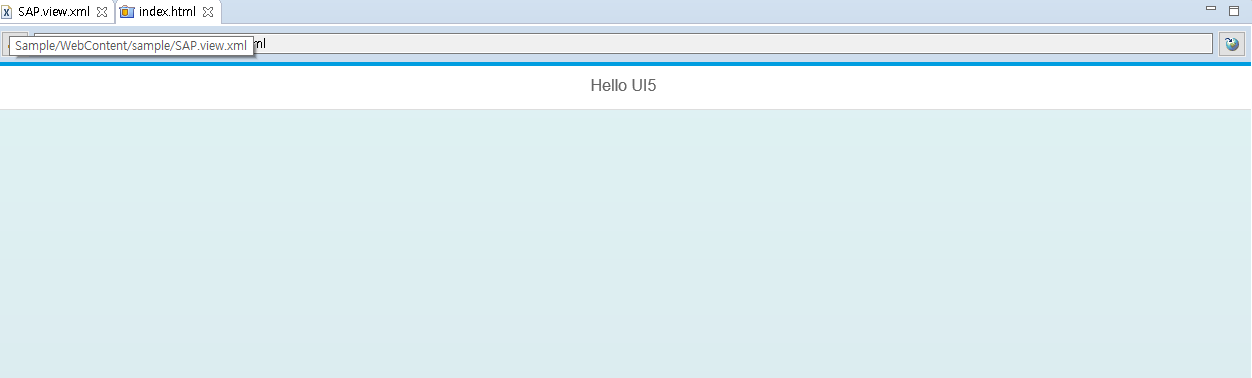 Ctrl + Shift + R 로 SAP.view.xml 찾아서 열기 > Title을 Hello UI5로 변경 <Page title="Hello UI5"> > 저장 > 프로젝트 우클릭 > Run As > Web App Preview > Hello UI5