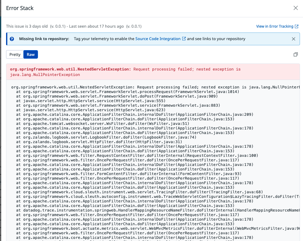 - 익셉션 발생 span을 선택하면, 하단에 정보창이 보이는데, Error 메시지의 View stack trace 를 클릭하면 prettier 버전과 Raw 버전의 stackTrace 가 출력된다.