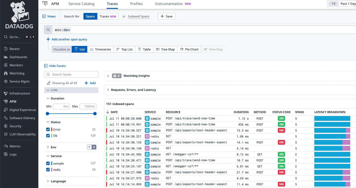 - 500에러건을 클릭하여 상세로 이동한뒤 Waterfall로 각 span의 호출순서와 오류 내용확인이 가능하다.