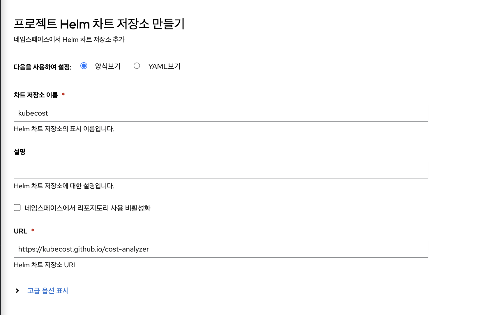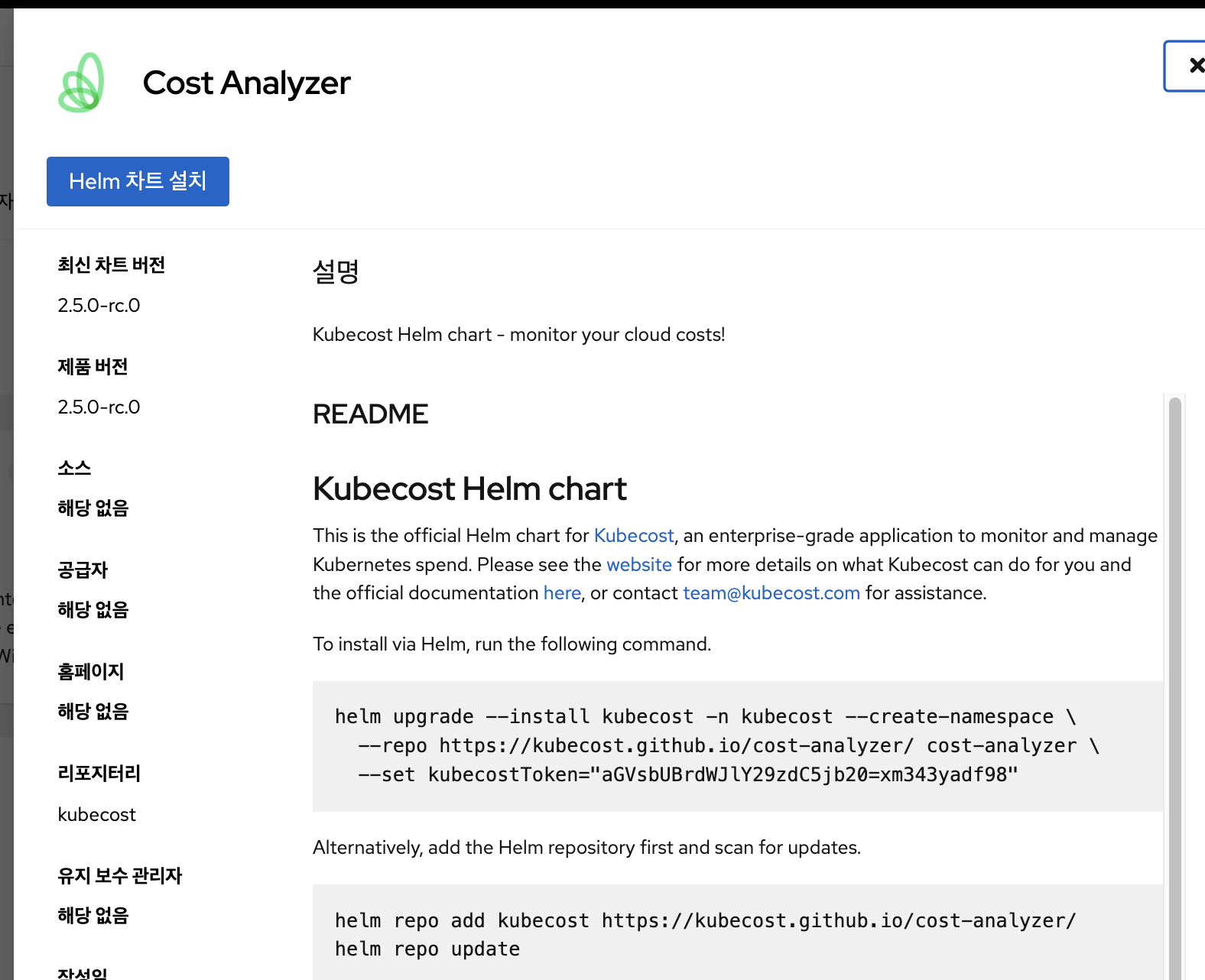 개발자 카탈로그에서 helm repository https://kubecost.github.io/cost-analyzer를 추가한다.